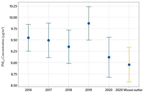 Yearly mean PM2.5 concentrations from 2016 to 2020. Error bars represent 95% confidence interval of the mean.