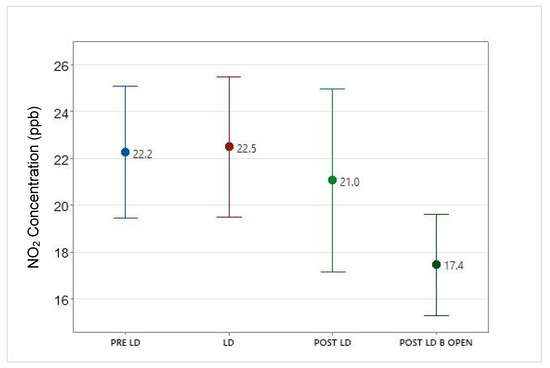 Change in mean NO2 concentrations before, during, and after the lockdown period. Error bars represent 95% confidence interval of the mean. Abbreviations: PRE LD: Pre-lockdown, LD: Lockdown, POST LD: Post-lockdown and POST LD_B OPEN: Post-lockdown—businesses open.