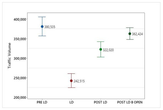 As expected, traffic levels significantly reduced during the lockdown period compared to pre-lockdown (p ≤ 0.05) and increased significantly during the post-lockdown period (Table 3). However, the average traffic volume in the post-lockdown period did not reach pre-lockdown levels and was significantly lower (p ≤ 0.05) than the pre-lockdown level (Figure 8). Post-ANOVA Tukey comparisons identified that the mean traffic volume during the lockdown period was statistically significantly lower compared to mean levels of all other periods analyzed (i.e., Pre-lockdown, post-lockdown including after businesses were open).