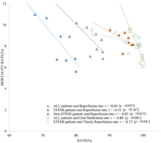 The process indicators included rates of reperfusion, timely reperfusion, and oral medication. The reperfusion rates indicate the proportion of patients who underwent reperfusion treatment. Reperfusion rates of patients with STEMI and NSTEMI were calculated, and the correlation between reperfusion rates and mortality in the two groups was analyzed.