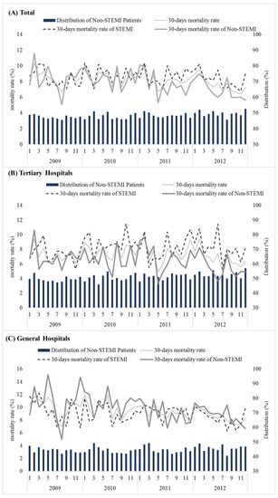 30-day mortality rate and distribution of NSTEMI patients (2009 to 2012). (A) Total; (B) Tertiary Hospitals; (C) General Hospitals.