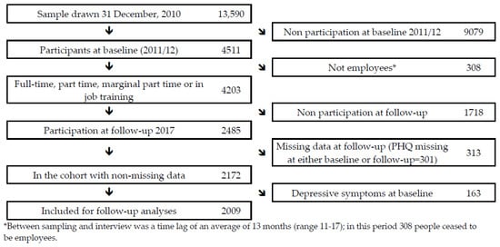 The present study is based on data from the German Study on Mental Health at Work (S-MGA): a nation-wide employee cohort study with a baseline in 2012 and a follow-up in 2017 [43]. At baseline, the population consisted of all employees in Germany aged 31–60 years included in a social security scheme set up by the government (i.e., without civil servants, self-employed individuals and freelancers) on the reference date of the 31 December 2010. Of the 13,590 employees who were randomly selected from 206 municipalities in Germany (stratified by region and population size), 4511 people completed the baseline personal interview that was conducted 13 months (range 11–17 months) after the sampling procedure was completed (baseline response rate: 33%) (Figure 1). During these 13 months, 308 people ceased to be employed, leaving 4203 employed participants at baseline; of these, 2485 also participated in the follow-up interview (follow-up participation among baseline participating employees was 59%, while the cohort participation was 20%; see Table 3). Cohort participation was independent of gender, but was dependent on age and socioeconomic position (SEP): participants 30–39 years of age and in a lower socioeconomic position had lower participation (Table 3). From these, 313 people were excluded, predominantly due to missing information on depressive symptoms. For the main analysis, 163 participants with depressive symptoms at baseline were excluded (see analysis section below). Thus, the final sample on which the present study is based amounts to 2009 employees.