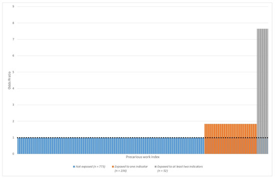 We then examined the association with the precarious work index (see description above) at baseline and depressive symptoms at follow-up, following the same adjustment procedure described above. Based on this index, the population attributable fraction (PAF) of depressive symptoms due to precarious work was computed according to the method developed by Miettinen [55]. PAF can be understood as the fraction of depressive symptoms at follow-up attributable to precarious work. It can be illustrated graphically as the fraction of the area of bars (surplus cases) over the odds ratio 1 out of the total area of bars (total cases) [55].