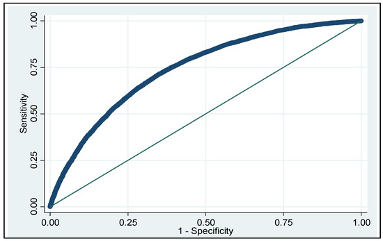 Application of the model to the test cohort (to verify its internal validity) produced an AUC of 0.736, 95% CI 0.727–0.746 (Figure 3). The difference in the AUC was 0.006 units and the DeLong test was significant (p < 0.001) despite the minimal differences in relation to the large sample size. The model met the classical internal validation criterion, i.e., a decrease in the C-statistic of no more than one-tenth of a unit.