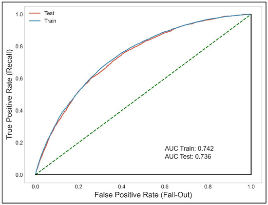 The final logistic model built on the training cohort was composed of ten variables and provided an AUC of 0.742 (95% CI: 0.737–0.747). This model was also applied to the test cohort, and both presented a moderate–high and very similar discriminant capacity (Table 3).