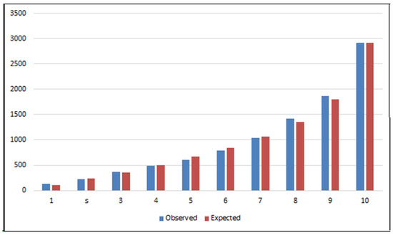 The calibration was also evaluated by the Hosmer–Lemeshow test and through the visual representation of the risk deciles (Figure 4). The Pearson test [30], which is highly recommended for large sample sizes, was also applied. This test showed there were no significant differences between the values observed and those predicted by the model (Pearson χ2 ungrouped, p = 0.176); the visual interpretation of the observed and expected deciles is consistent with this result.