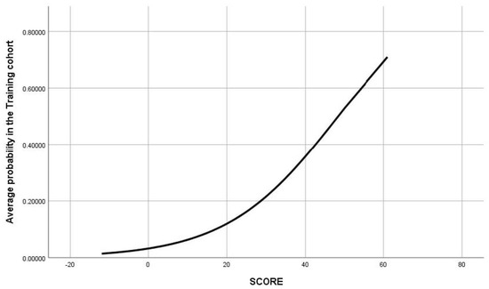 The risk score produced values in the range of −12 to 61 points. Its graphical representation facilitates a rapid estimate of the relation between the score on the probability curve and the risk of death (Table 4 and Figure 5).