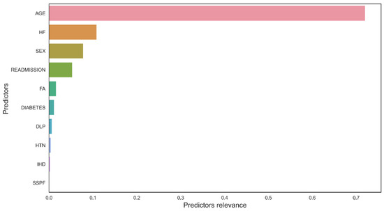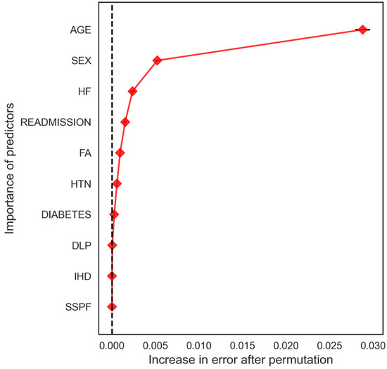 From the perspective of DL, a random forest analysis provided the variables with the highest weights as possible predictors of mortality (Figure 6), with age, heart failure, readmission and female sex, among others, standing out. The permutation test reduced the overestimation of the RF (Figure 7) although the same variables were maintained.
