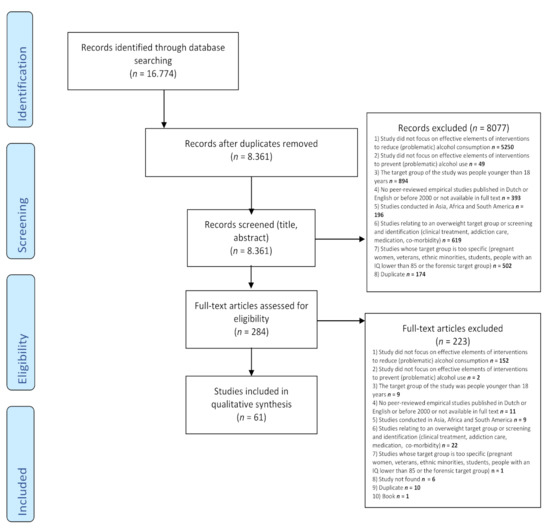The studies were selected with the following inclusion criteria: (1) studies that focused on interventions for outpatients to prevent or reduce (problematic) alcohol consumption and that mentioned effective elements; (2) the target group of the studies consisted of people aged 18 years or older; (3) peer-reviewed empirical studies published in English after 2000 and available in full text; and (4) studies conducted in Western high-income countries (e.g., Europe, North America, Australia and New Zealand). The exclusion criteria were the following: (1) studies aimed at inpatients; and (2) studies with a very specific target group (i.e., pregnant women, veterans (due to the specific approach of this group, often carried out by the military), ethnic minorities, students, people with an IQ lower than 85 or the forensic target group).