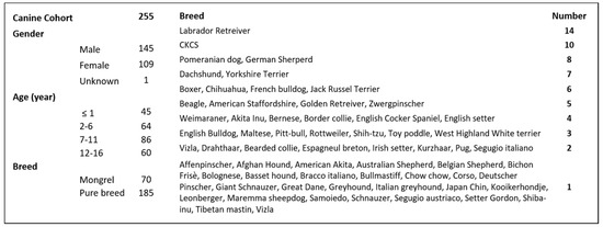 The cohort of dogs included in this study was composed of 70 crossbred dogs and 185 pedigree (purebred) dogs, with ages ranging from very young (<one-year-old) to 16 years and with males over-represented (Figure 1). Among the 64 different breeds and hybrids, Labrador retrievers and Cavalier King Charles Spaniels (CKCS) were most common, comprising 14 and 10 dogs, respectively; other breed(s) numbered less than 10 dogs each (Figure 1).