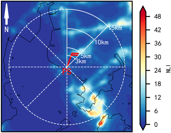 where s = 1, 2, …, 8, d is the upstream distances (3, 5, 10, and 15 km in this study), m is the number of grids in s-th sector in a circle with a radius of d, and is the NLI value on i-th grid (i = 1, 2, …, m).