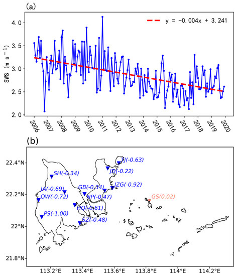 Regardless of wind direction, we first focused on the overall trend of SWS. Figure 3a shows the inter-annual variations of monthly SWS during 2006–2019. Overall, the SWS shows an obvious declining trend with a rate of −0.53 m s−1 per decade, which is significant at the 95% confidence level. The rate of decrease in Zhuhai is larger than most of the documented rates in other regions [4,5,6,7], since the study area is one of the fastest developing areas in China during the past decades.