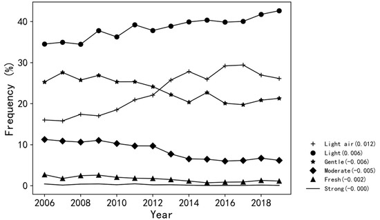 where is the frequency of i-th grade wind during a stationary period, is the count of observed i-th grade wind, and is the total count of observed wind. The definition of the wind speed grade follows the standard of the Beaufort wind scale [36]. Figure 4 illustrates the inter-annual variations of annual wind frequency ranging from grade 1 (light air) to 6 (strong) during 2006–2019. Overall, the weak winds (especially for the second grade) dominate the frequency distribution, and changing trends vary among different wind grades. In particular, the frequencies of both first and second grade winds have been observed with an obvious increasing trend, with the former increasing from 0.18 to more than 0.3 during 2006–2016, and the latter surging since 2006 and reaching 0.44 in 2019. The frequencies of stronger winds have decreased gradually since 2010, with the third (fourth) grade peaking in 2007 (2006) and declining since then. In other words, the long-term decline in SWS in Zhuhai has been mainly caused by the decrease in the frequency of gentle and moderate winds. However, despite the overall SWS decline, the almost invariant frequency of the strong wind could provide an important implication that the risk of the extreme wind remains in the context of global warming, which should be under consideration for both disaster prevention and building construction.