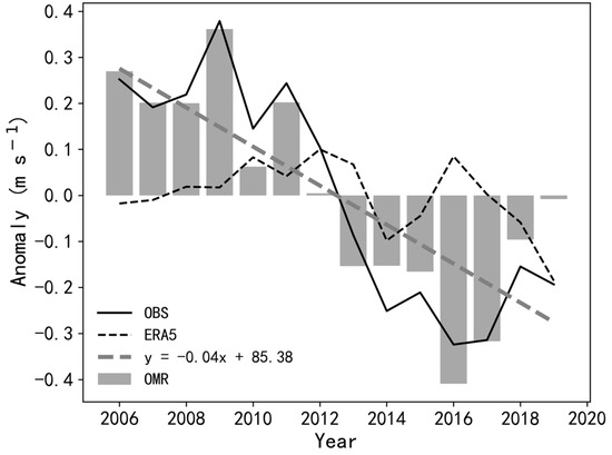 We employed the OMR method to compute the wind speed affected by the surface roughness change. Figure 5 shows the inter-annual variations of averaged SWS from anomalies of observations (OBS) and reanalysis (ERA5), as well as from OMR methods. As compared to the ERA5, both OBS and OMR present significant downward trends (95% confidence level), with the latter (−0.4 m s−1 per decade) accounting for 75.5% of the former (−0.53 m s−1 per decade). It also indicates a limited change of the background circulation over Zhuhai during recent decades, which has been clearly revealed from both the ERA5 reanalysis (Figure S1) and the observed 700 m radar measurements (Figure S2).