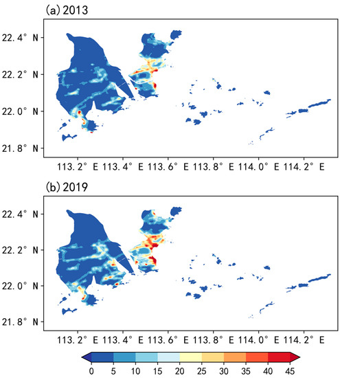 In this study, the NLI index is used to represent the urbanization characteristics [37]. Figure 7 displays geographic distributions of the NLI over Zhuhai in 2013 and 2019. It can be seen that the areas with the high NLI are extending and the NLI values are increasing from 2013 to 2019. In the case of 2019, the NLI presents an obvious spatial variation. The east part is typically regarded as the main urban area, corresponding to a high value of 30–45 for NLI, with the maximum of about 50 located in the coastal areas. The coastal area of the west part is also characterized by a high value of NLI ranging from 20 to 40. Moreover, there are several scattered town canters in the central region, with a magnitude range of 15–30 for NLI.