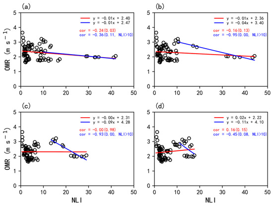 Scatter diagrams of annual OMR (m s−1) against NKL using the fan-sector method when the upstream distance is set to (a) 3, (b) 5, (c) 10, and (d) 15 km, with the red and blue lines denoting the fitted lines for all samples and samples of NLI greater than 10 only, respectively.