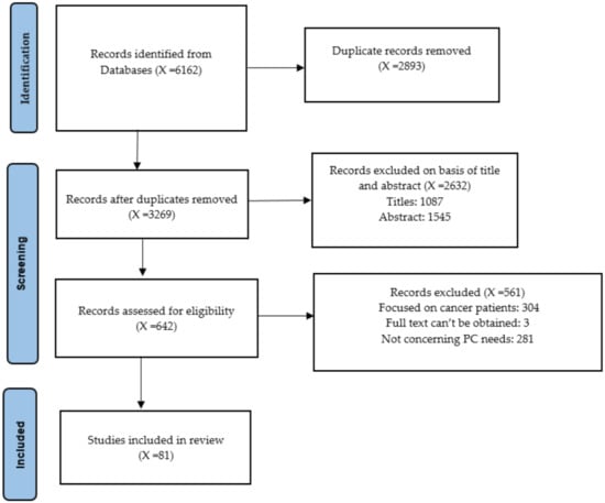 Thorough electronic searches were carried out in the Medline, Embase, Cumulative Index to Nursing and Allied Health Literature (CINAHL), Web of Science, Cochrane Library, PsycINFO, and Scopus databases covering the period January 2009 to February 2022. A range of keywords and subject headings indicating PC needs, older people’s needs, patients, families, non-formal caregivers, and health care professionals were used to maximize the retrieval of relevant studies. The specific questions addressed within this review were: