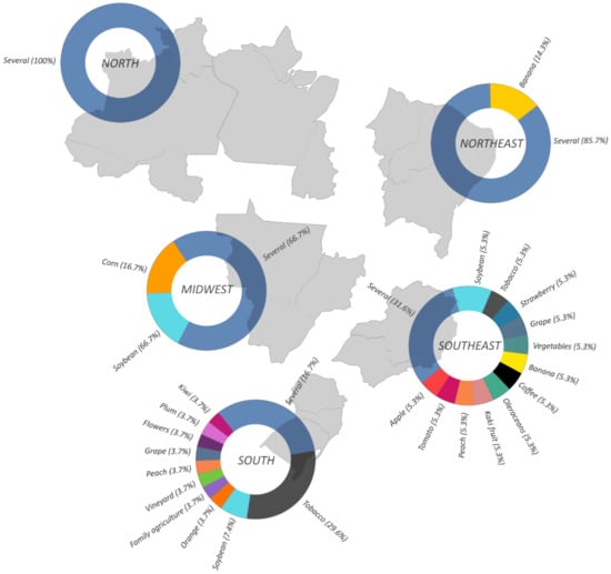 - Pignati, W.; Lima, F.; Lara, S.; Correa, M.; Barbosa, J.; Leão, L.; Pignatti, M. Distribuição espacial do uso de agrotóxicos no Brasil: Uma ferramenta para a Vigilância em Saúde. Ciênc. Saúde Colet. 2017, 22, 3281–3293. [Google Scholar] [CrossRef] [PubMed]