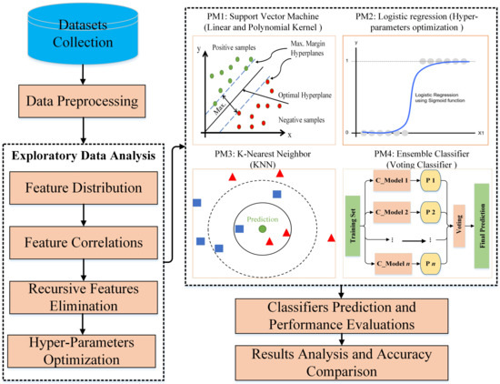PM4—EC: The fourth model applies the ensemble classifier method as a predictive model. It aims to maximize the precision and recall value to detect all malignant tumors in the WDBC dataset and detect all cancer presence in the BCCD dataset. Our research applied an ensemble classifier to optimize the logistic regression model [40,41]. Ensemble classifiers have many types, i.e., bagging, boosting, and voting [42]. The kind that will be used in this research is the voting classifier. A voting classifier combines various machine learning algorithms such as SVM, LR, or KNN. Then, we ran them on the same dataset to get the prediction result of each model. Finally, it will take a majority vote to make a final prediction. For example, the voting classifier trained three algorithms; algorithm 1 resulted in “1”; algorithm 2 resulted in “0”; and algorithm 3 resulted in “0”. The final result will be “0” because two of them are “0” and only one is another option.