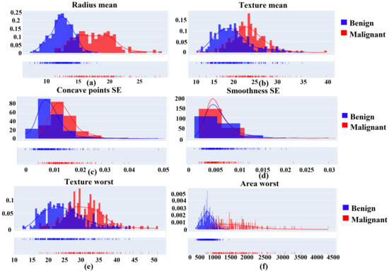 Feature distribution of WDBC dataset with samples of (a) Radius mean, (b) Texture mean, (c) Concave points SE, (d) Smoothness SE, (e) Texture worst, and (f) Area worst.