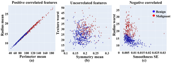 Furthermore, Figure 4 shows the feature correlations based on positively correlated features (proportional relationship) (a), uncorrelated features (no relationship) (b), and negatively correlated features (inversely proportional relationship) (c) among different features and samples. For instance, Texture worst and Symmetry means do not have any effective correlation (b). We presented a few features matrices due to a lack of space in this study. In conclusion, the feature distribution and correlational analysis enabled the proposed prediction models to detect the tumor more precisely. It is essential to mention that 80% of the total data set was used for training, and 20% of the data set was used for testing. The correlation matrix for all features is illustrated in Note 2 (Figures S2 and S3) in the Supplementary Materials. It shows the correlation of each pair of features by using a color and value system to distinguish between positive, uncorrelated, and negatively correlated features easily. For example, according to the WDBC dataset, area mean and radius mean are positively correlated features; Texture mean and smoothness mean are uncorrelated features; and smoothness SE and radius mean are negatively correlated features. According to the BCCD dataset, insulin and HOMA are positively correlated features; leptin and MCP.1 are uncorrelated features; and resistin and adiponectin are negatively correlated features.