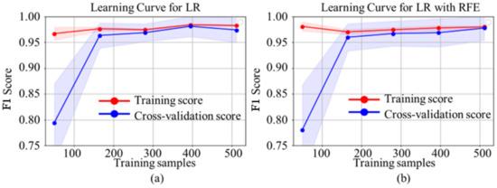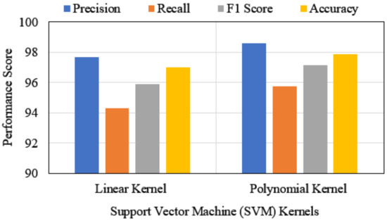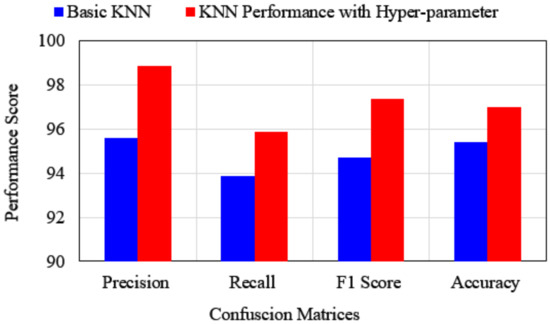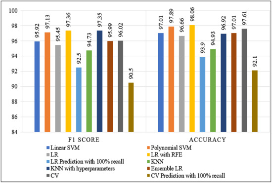 After the individual classifier performance analysis, Figure 8 depicts the performance analysis of different classifiers and methods based on accuracy and F1 score with cross-validation matrices. The lowest performance was delivered by CV prediction with 100% recall, (basic) KNN, and LR prediction with 100% recall, where the F1 score and accuracy values were below 95%. In this comparison, LR with RFE outperformed other methods and achieved 98.06% accuracy and 97.36% F1 score. Meanwhile, polynomial SVM, CV, and KNN with hyperparameter performance are beneficial. Therefore, based on these analyses, it is clear that LR with RFE performance is higher than all other methods in cross-validation.