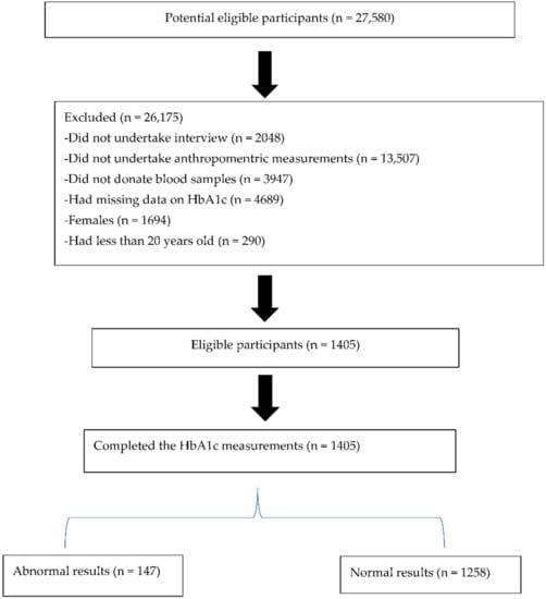 Of these individuals 17% had missing data on HbA1c and therefore were excluded. A further screening of completeness of data on weight, height, waist and hip circumferences was undertaken. Additional exclusion of those with missing data on the aforementioned indicators was undertaken, resulting in a total sample of 4083 males and females. Of these individuals, because the focus of this research was on males, females were excluded and all males aged 20 years and older (41.5% [N = 1405]) were included in the current analyses. A summary flow diagram of participant selection for this study is presented in Figure 1. Additional information about the SANHANES-1 methodology, content, and laboratory procedures can be found elsewhere [,].