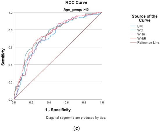 Moreover, our current outcome that suggested age to be a confounder when using anthropometric indices to predict the risk of DM is also corroborated by other similar international studies [,,,]. For instance, Chen et al. [] and Cheng et al. [] have shown that age mediates the ability of these anthropometric indices to predict metabolic syndrome (MetS), and its components such as DM and hypertension. For this reason, in the current study, participants were stratified into two age groups. Despite AUCs lower than the outcomes of the overall analysis, the AUCs showed that WC and WHtR still performed better in predicting the risk of DM in older men (the AUCs were both above 75%), while WHtR even performed close to excellent in predicting the risk of DM in younger men (AUC = 79%). These outcomes are in contrast to those reported in other international studies, where anthropometric indices such as WHtR are shown to have stronger associations with cardiometabolic risk factors including DM in middle- to older-adult population groups, compared to the younger adults [,]. In these studies, such differences were attributed to fat mass gain and lean mass loss at old age [,]. However, we acknowledge that participants in these studies were stratified into three and more age groups, while we only stratified the participants into two age groups in our study.