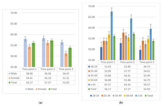 The mean WHO-5T scores were 56.17 (95% CI: 54.77, 57.58), 57.27 (95% CI: 55.89, 58.65), and 53.93 (95% CI: 52.54, 55.31) in the three time points, respectively. During the pandemic, the lowest average WHO-5T showed in time point 3 in December 2020. According to Bech et al. [21], the score of WHO-5T ranges from 0 to 100, representing the spectrum from completely absent (0) to the highest level of SWB (100), and thus indicating a mental burden in December 2020. As depicted in Figure 1, the mean WHO-5T of males is higher than of females at all time points. Most notably, the difference between males and females was greater at time point 3, compared to the other time points. Considering the age groups, data showed the lowest WHO-5T score for younger people (aged between 18–24 years) during the pandemic in 2020. Interestingly, the elderly population generally had the highest WHO-5T during the pandemic phases. For age groups stratified by gender at each time point (Table A2), the WHO-5T for females are similar for time points 1 and 2 and the lowest scores are present in time point 3 for each age group, especially for the elderly population. However, there was another pattern in the male group. The lowest WHO-5T scores were not always in time point 3 for each age group.