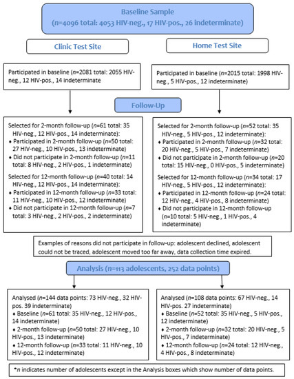 Numbers of baseline participants recruited for follow-up (all with positive and indeterminate HIV test results and a 1.7% sample of those with negative results) and resulting numbers with survey data are shown in Figure 1. The analytical sample comprised the 113 adolescents who had been selected for follow-up sessions from the clinic and home testing sites (17 HIV-positive, 26 indeterminate, and 70 HIV-negative at baseline). The numbers of youth that participated in the 2-month follow-up were 15 out of 17 HIV-positive (88.2%), 20 out of 26 indeterminate (76.9%), and 47 out of 70 HIV-negative (67.1%). Participation in the 12-month follow-up was as follows: 14 out of the 17 HIV-positive participants (82.4%), 20 out of 26 indeterminate participants (76.9%), and 23 out of 31 HIV-negative participants recruited (74.2%). Overall, 82 of 113 selected youth (72.6%) and 57 of 74 selected youth (77.0%) participated in the 2-month follow-up and 12-month follow-up, respectively. The 113 participants provided a total of 252 records of data across the timepoints.