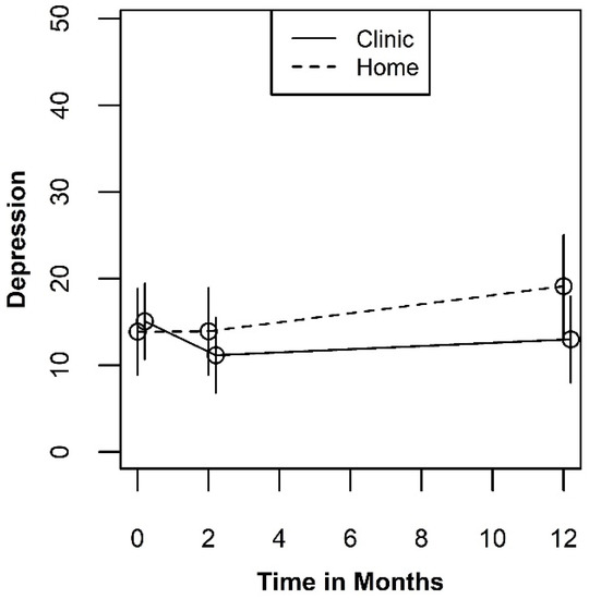 The mean plots for depression shown in Figure 5 indicate a more consistent benefit for testing at the clinic than was observed for either of the two QOL measures. The Type III test results point to a potentially significant two-way interaction between timepoint and testing site (p = 0.078). A least squares mean plot of the two-way interaction is shown in Figure 6. When averaged over the three test result categories, the pattern of differences between the levels of testing sites indicates a benefit of testing in a clinic that is largest at the 12-month measurement occasion (SMD = −0.467; 95% CI: −1.057, 0.123). This effect is larger than either of the effects we observed for the QOL outcomes but would still be considered a “medium” effect size. If real, the appearance of a benefit for testing at clinic at 12 months points to a psychological process that unfolds gradually over time. None-the-less, these results should be interpreted with caution since the confidence intervals also include the null effect.