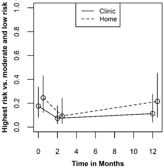 The mean plots for sexual behavior are shown in Figure 7. The plots display the fitted probabilities of being in the riskiest category verses either of the two lower risk categories. Due to the standard proportional odds assumption in cumulative logit models, the fitted probabilities for the high and medium versus low-risk categories show the same pattern. The mean plots evidence a very slight benefit for testing at home that is consistent across all three time periods. However, the Type III tests for either the main effect of testing site or the interaction with measurement occasion indicate that the effect of testing site on sexual behavior did not result in conclusive evidence against the null hypothesis (p = 0.389 and p = 0.821, respectively). Thus, these data provide very little evidence that testing site influences sexual behavior.