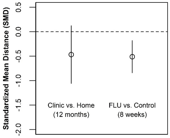 To evaluate model fit, we created mean plots from the estimated models and overlayed plots of the observed data. We performed type III statistical tests for the model fixed effects. Rather than adopting a strict statistical significance threshold (e.g., p < 0.05), we report the p-values out to three significant digits and conduct follow up analyses on home vs. clinic comparisons that are suggestive. We also confined our attention to those model effects that include the treatment indicator (clinic vs. home) and report point, and interval estimates as standardized mean differences (SMD), calculated by dividing the estimated difference in means by the square root of the within-subject variance components. When an estimate involved averaging over all three measurement occasions, we pooled/averaged the variance components for each measurement occasion before taking the square root. All effect estimates that averaged over the levels of predictors in the model not represented in the comparison (i.e., measurement occasion and baseline test result) were uniformly weighted, irrespective of the sample sizes for each level. Finally, we employed the conventional Cohen’s D thresholds to characterize the size of the estimated effect as “small” (SMD < 0.2), “medium” (0.2 < SMD < 0.5) or large (SMD > 0.8).