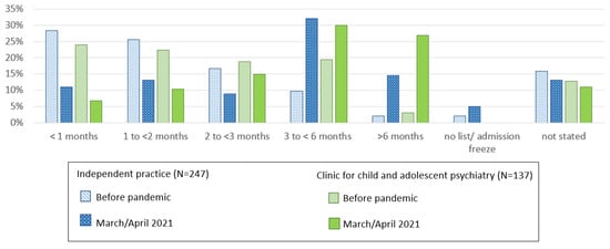 According to 33% of participants, the demand increased by up to 50% more than usual, and 24.9% of participants stated a 50 to 100% higher demand than usual (Table S1). Moreover, 65.8% of participants reported that patients had to wait longer for initiation of treatment during the pandemic than before (Table 3a). A further 11% of participants indicated that while the waiting time had not changed, this was because they had made adjustments in response to the increased demand (Table 3a). When asked to indicate the mean waiting time in months until initiation of treatment, 48.6% of participants indicated a pre-pandemic waiting time of less than two months, compared to about 20% in March/April 2021. Currently, almost half of the participants (48.5%) reported a waiting time of three months or more, compared to 15.3% before the pandemic (Tables S2 and S3). When separately analyzing the responses from mental health professionals working in clinics for child and adolescent psychiatry and those in independent practices, it became evident that, even before the pandemic, clinic waiting times tended to be longer than waiting times in independent practices (22.4% vs. 11.7% more than three months). In March/April 2021, for admission to child and adolescent psychiatry clinics, 29.9% of responses indicated a waiting time of over three months and 26.9% of responses indicated a waiting time of over six months. By contrast, for admission to independent practices, 32.0% of the responses indicated a waiting time of over three months and 14.6% of responses indicated a waiting time of over six months (Figure 1).