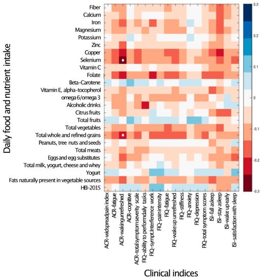 To explore the possible quantitative correlation between participants’ dietary intake and symptom severity, the daily intake of micro- and macronutrients was correlated with the clinical indices of fibromyalgia. Other than waking up unrefreshed, which was negatively correlated with the intake of selenium and grains, no significant correlations were detected between the intake of any nutrient and the severity of any symptoms (Figure 1).