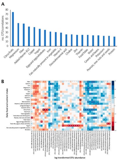 The correlation of macro- and micro-nutrient intake with the relative abundance of all bacterial taxa was explored. A total of 1831 significant correlations were observed (p < 0.01), corresponding to 574 OTUs. These comprised 129 OTUs, which could be identified as putative species. The number of bacterial taxa for which a significant correlation with the intake of certain nutrients was observed differed between nutrients. This number ranged from only 1 correlated taxon for poultry consumption to 75 correlated taxa for citrus fruits (Figure 2A). The nutrients or foods that correlated with the highest number of bacterial taxa were citrus fruits, magnesium, fiber, copper and yogurt.