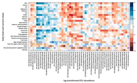 Daily nutrient intake is mostly not associated with the relative abundance of OTUs differentially abundant (DA) in fibromyalgia. Heat map of a univariate Kendall correlation matrix between DA taxa abundance (log2; x-axis) and selected daily macro- and micronutrient, and food group intake (y-axis). Heatmap is sorted based on a hierarchical clustering of DA OTUs. Blue shades indicate positive correlations while red shades indicate negative correlations (−0.3 < tau < 0.3). Statistically significant correlations (BH FDR p < 0.05) are marked with a white circle. Food intake units are provided in Table 3. HEI 2015–Healthy Eating Index 2015.