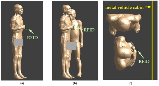 - Zradziński, P.; Karpowicz, J.; Gryz, K.; Owczarek, G.; Ramos, V. Modelling and Evaluation of the Absorption of the 866 MHz Electromagnetic Field in Humans Exposed near to Fixed I-RFID Readers Used in Medical RTLS or to Monitor PPE. Sensors 2021, 21, 4251. [Google Scholar] [CrossRef] [PubMed]