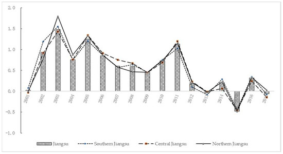 The descriptive statistical analysis of the data is shown in Table A2. It shows that the development of counties in Jiangsu is significantly different. The level of economic development is decreasing in the order of Southern Jiangsu–Central Jiangsu–Northern Jiangsu, and Central and Northern Jiangsu are relatively close. For example, during the study period, the average GDP per capita of the three regions was 64,300 CNY/person, 30,000 CNY/person, and 19,800 CNY/person, respectively. The same is true for the carbon emissions per capita , the proportion of the tertiary industry , foreign trade dependence and energy utilization efficiency . In particular, the level of foreign trade dependence is “far ahead” in Southern Jiangsu. However, the ranking of environmental regulation in inter-regions has changed, but it is still the highest in Southern Jiangsu, and the lowest in Northern and Central Jiangsu. These characteristics can be observed from the means of the data in the three regions.