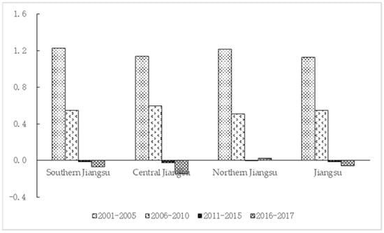 Table 2 shows that from 2001 to 2005, carbon emissions and economic growth in 30 counties were in a status of expansive coupling (II). Among them, there were 6 in Southern Jiangsu, 9 in Central Jiangsu, and 15 in Northern Jiangsu. A total of 21 counties showed expansive negative decoupling (I), including 6 in Southern Jiangsu, 5 in Central Jiangsu, and 10 in Northern Jiangsu. Two counties showed weak decoupling (III), both of which belong to Southern Jiangsu. From 2006 to 2010, 50 counties showed weak decoupling (III), and the remaining 3 counties showed expansive coupling (II), including 1 in Southern Jiangsu, 1 in Central Jiangsu and 1 in Northern Jiangsu. From 2011 to 2015, there were 25 counties with weak decoupling (III) in their carbon emissions, including 9 in Southern Jiangsu, 6 in Central Jiangsu, and 10 in Northern Jiangsu. The remaining 28 counties showed the characteristics of strong decoupling (IV), including 5 in Southern Jiangsu, 8 in Central Jiangsu, and 15 in Northern Jiangsu. From 2016 to 2017, 23 counties (8 in Southern Jiangsu, 2 in Central Jiangsu and 13 in Northern Jiangsu) and 30 counties (6 in Southern Jiangsu, 12 in Central Jiangsu and 12 in Northern Jiangsu) showed weak decoupling (III) and strong decoupling (IV) characteristics. It can be seen that since 2011, 53 counties in Jiangsu achieved the decoupling of carbon emissions and economic growth. In particular, the counties with strong decoupling characteristics are distributed in Southern, Central or Northern Jiangsu, which also indicates that whether economic growth decouples from carbon emissions is not necessarily related to geographical division. However, Central Jiangsu has the highest proportion of counties that entered a strong decoupling stage, which is different from Tapio’s [15] research conclusion of a higher proportion of counties entering a decoupling status for high-income groups. To some extent, this indicates that the county economy in Jiangsu has been an extensive rather than intensive development mode in the past few decades.