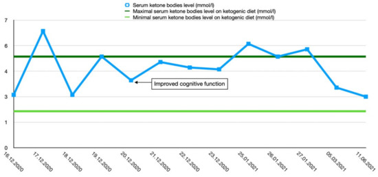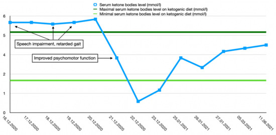After the final diagnosis of GLUT1-DS, a ketogenic diet for both patients was started based on KetoCal, along with valproic acid treatment. At first, a ketogenic ratio of 3:1 was used, but ratio adjustment was required due to an inadequate level of serum ketone bodies. The patients’ general condition and symptoms fluctuated over the course of the treatment and depended on the level of ketone bodies in their serum. Changes in serum ketone body levels and patients’ clinical presentation are shown in Figure 1 and Figure 2.