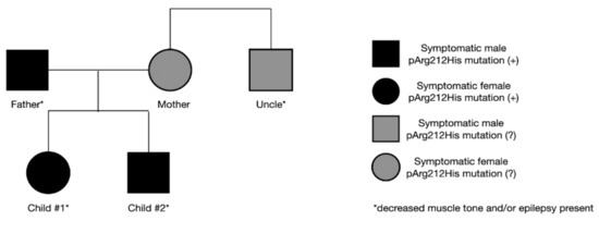 The father’s final diagnosis of GLUT1-DS was made alongside the siblings. As a child, he presented symptoms of hypotony and generalized seizures. Symptoms disappeared as he grew older, and no treatment was implemented at any time. Currently, mild intellectual disability is observed. Due to his medical history and current state, genetic testing for SLC2A1 gene mutation was performed, yielding a positive result. In the family, other neurological symptoms are also present. The mother suffers from mental impairment and psychological disorders, and her brother presents a decreased muscle tone. Both have never been tested for SLC2A1 gene mutation (Figure 3). The study conducted by S. Girirajan indicated that the phenotypic variation in some neurological genomic diseases may be associated with the coexistence of additional large variants that are more likely transmitted by females [9]. The importance of these data remains inconclusive in our case, as the mother refused to be tested.