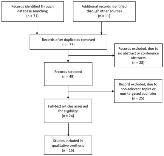 - Moher, D.; Liberati, A.; Tetzlaff, J.; Altman, D.G. The Prisma Group. Preferred reporting items for systematic reviews and meta-analyses: The PRISMA statement. PLoS Med. 2009, 6, e1000097. [Google Scholar] [CrossRef] [PubMed] [Green Version]