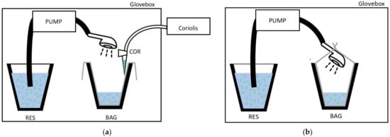 Experimental setup inside the glove box design (a) to collect the water contaminated with Legionella in controlled conditions in a bag (BAG); (b) to collect the bioaerosols during showering with a Coriolis® Delta air sampler in a water sample (COR). RES: Legionella suspension reservoir.