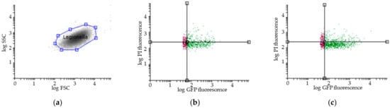 The total number and viability of Legionella were determined in the reservoir, bag, and bioaerosols by flow cytometry assays (FCAs) at 3 ± 1 h after sampling. As previously described [35,39], 1 mL of each sample was directly labelled with 5 μL of propidium iodide (PI) at 1 mg/mL (Invitrogen P3566) in the dark for 5 min. The FCA profiles of the samples (Figure 2) were obtained using a combination of GFP green fluorescence (viable cells expressing GFP, i.e., viable and cultivable (VC) and viable but noncultivable (VBNC)) and propidium iodide (PI) red fluorescence for cells with damaged membranes (VBNC and dead cells (DC)). Flow cytometric measurements were performed using a CyFlow Cube6 instrument (Sysmex Partec, Görlitz, Germany) equipped with an aircooled argon laser (488 nm emission; 20 mW). The green fluorescence emission from GFP was collected in the FL1 channel (500–560 nm), and the red fluorescence from PI was collected in the FL3 channel (670 nm). A threshold was applied to the FL1 channel to eliminate background signals. Analyses were performed at a low-flow-rate setting at 40 µL. The results were analysed with Flowing Software 2.5.1 (Turku Bioscience, Turku, Finland).