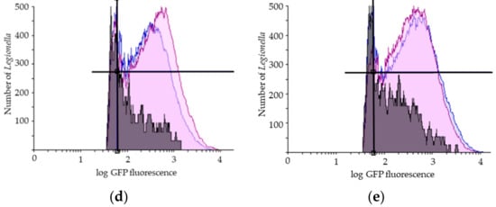 Representative results of flow cytometry assay (FCA). (a) Legionella pneumophila population gating, SSC (Side Scatter), FSC (Forward Scatter); Viability FCA profiles of Legionella pneumophila in bioaerosols after showering with (b) one representative STA showerhead and (c) one ECO showerhead (VC: GFP+/PI−; VBNC: GFP+/PI+; DC: GFP−/PI+); Overlays of the number of Legionella pneumophila (y-axis) in the reservoir (in blue), in the bag (in purple) and in the aerosols collected with the Coriolis (in grey) as a function of GFP fluorescence (x-axis) for (d) one representative STA and (e) one ECO showerhead analysis. GFP: Green Fluorescent Protein; PI: Propidium Iodide. The black lines indicate the thresholds for the fluorescence signal considered positive.