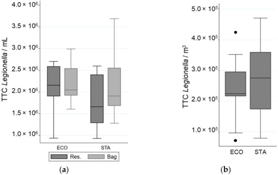 Variation in Total Cell Counted (TCC) of L. pneumophila in different samples when a “standard” (STA) or an “economic” (ECO) showerhead was used with an equal volume of water: (a) in the reservoir (Res.) and in the bag; (b) in the aerosols. The whiskers indicate the minimum and the maximum value, the box covers the values between the first and third quartile and the line in the box marks the median value.