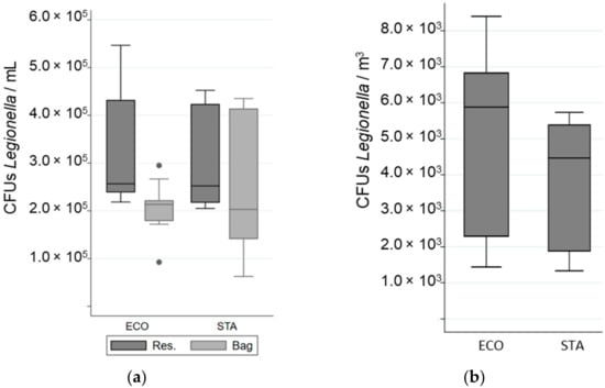 Variation in the number of Colony Forming Units (CFUs) of Legionella in different samples when a “standard” (STA) or an “economic” (ECO) showerhead was used with an equal volume of water: (a) in the reservoir (Res.) and in the bag; (b) in the aerosols. The whiskers indicate the minimum and the maximum value, the box covers the values between the first and third quartile and the line in the box marks the median value.