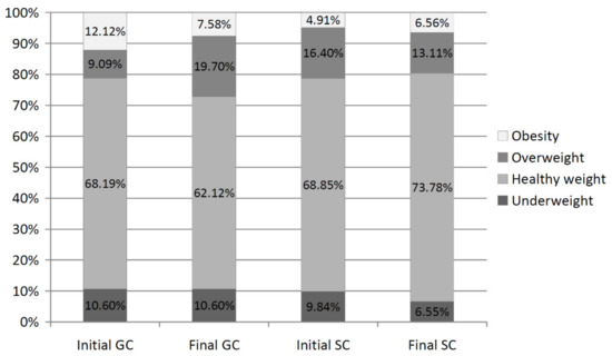 The BMI of the GC boys with healthy weight was similar to that for the SC and in the initial and final measurement sessions was equal to 17.25 and 18.45 kg/m2, respectively (p = 0.007). While the BMI for the SC was equal to 17.37 and 18.47 kg/m2, respectively (p = 0.004).