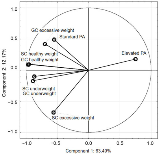 PCA analysis indicated that excessive body weight (i.e., overweight and obesity) in the SC children was negatively correlated with the elevated number of PE lessons (Figure 6). However, in the GC children excessive body weight was positively correlated with standard number of PE lessons. This suggested that an elevated number of PE lessons, reflecting the time of physical activity at school, was positively associated with healthy BMI of children and led to a reduction in the risk of excessive body weight.